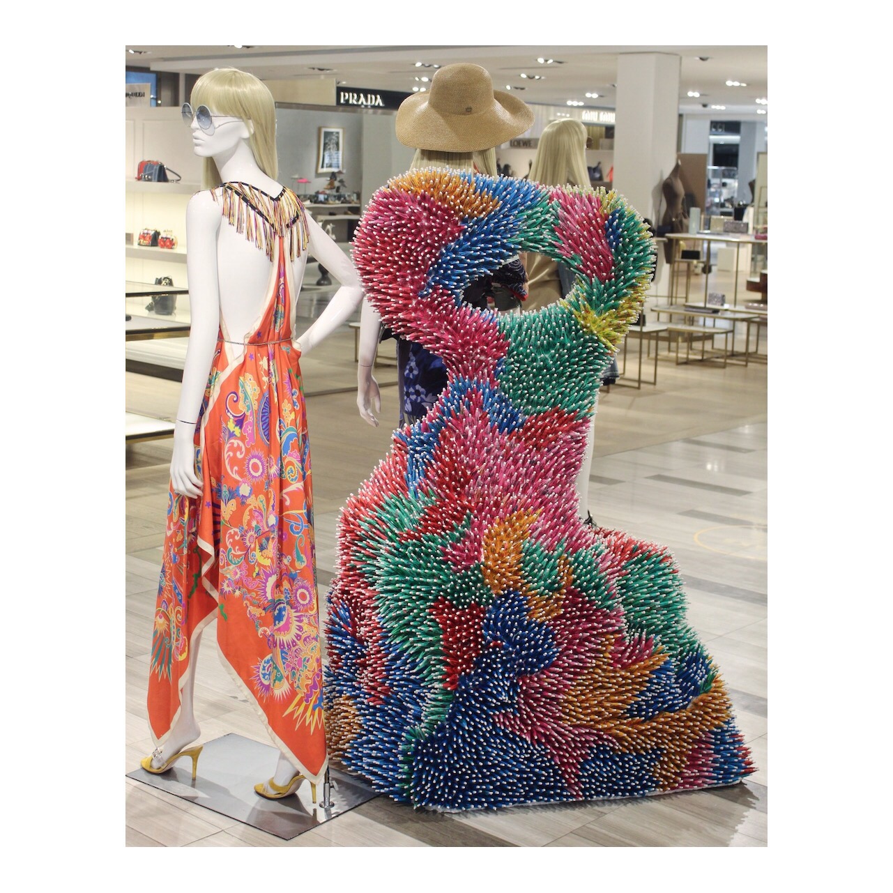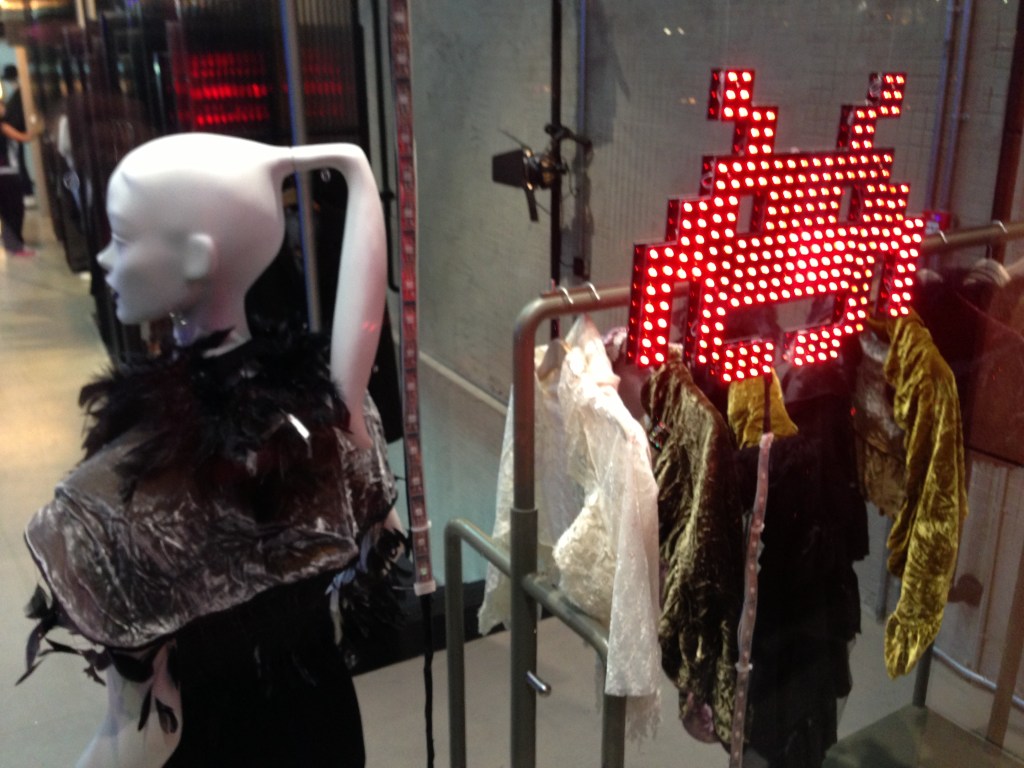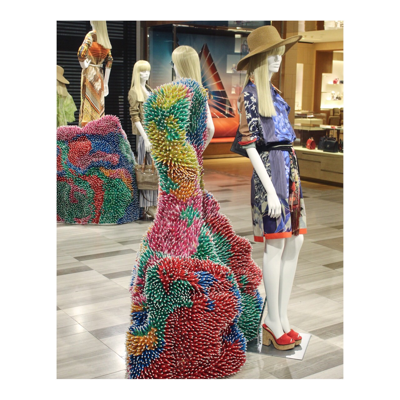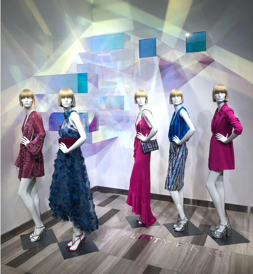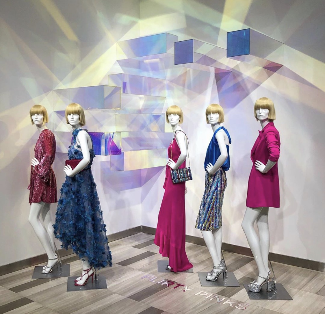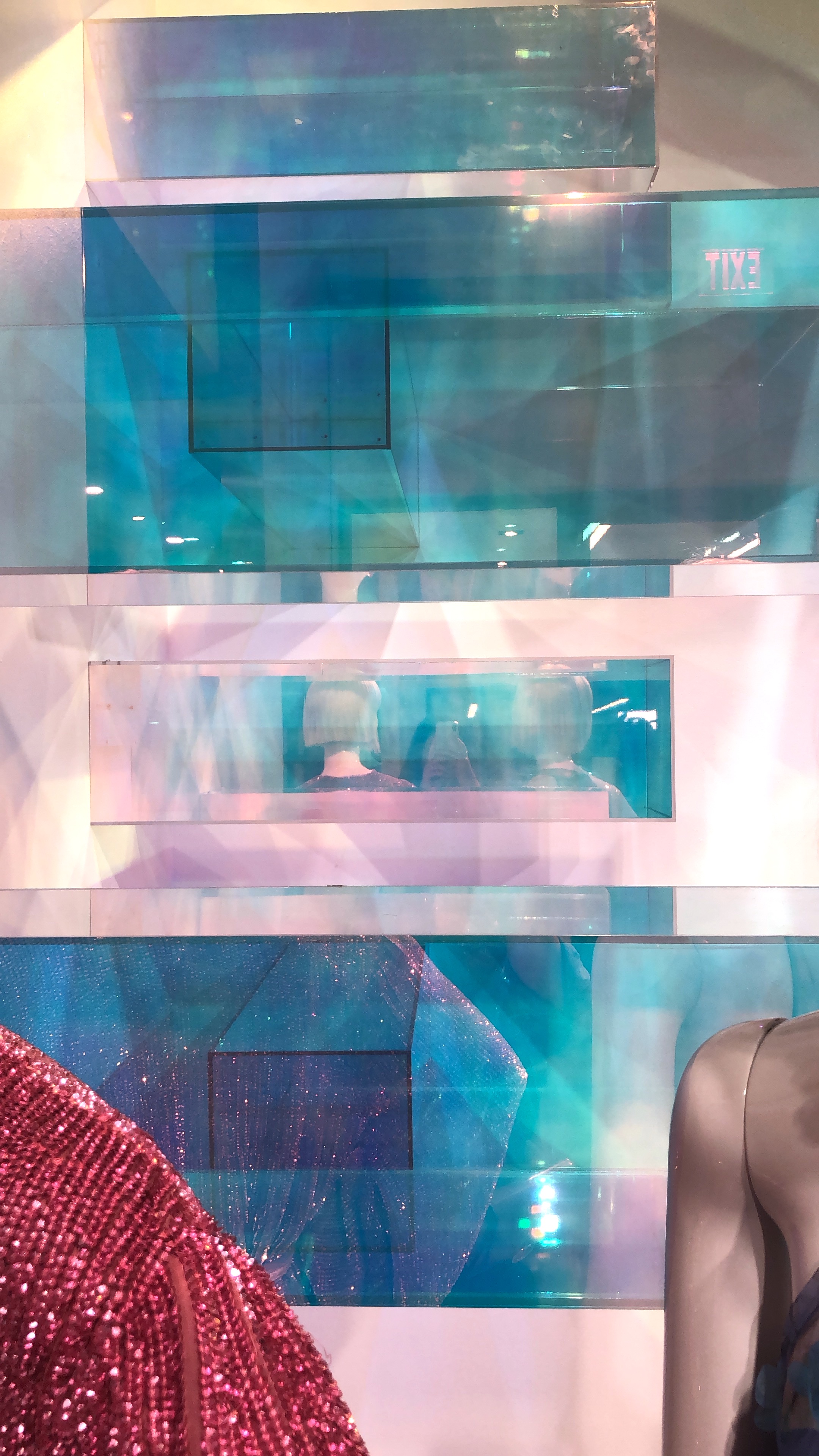 Playing with lights and reflective prisms with these iridescent blocks on the wall. Mannequins styled by me with Le Superbe, Marchesa, Jay Godefrey, Retrofete.